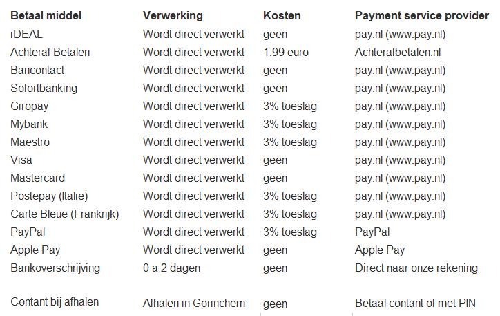 Zodra Q24U uw betaling ontvangen heeft streven wij ernaar uw bestelling dezelfde werkdag te verzenden. U heeft de keuze uit diverse betaalmogelijkheden onderstaand een overzicht van de betaalmogelijkheden en de eventuele kosten hiervan, ook wordt aangeven welke Payment service provider de betaling uitvoert.